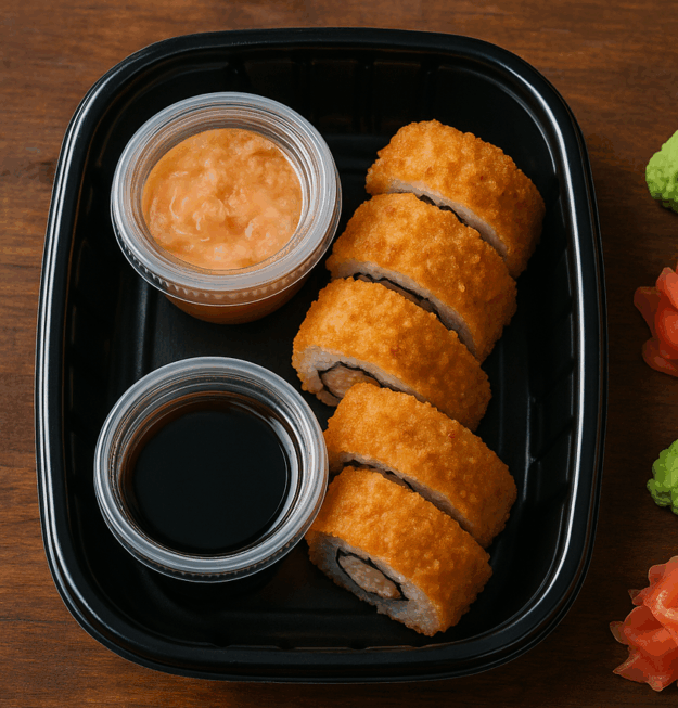 + Free ShippingRollo empanizado y dorado al punto perfecto, relleno de arroz, pepino, aguacate, queso filadelfia y proteína a elegir (pollo o surimi).